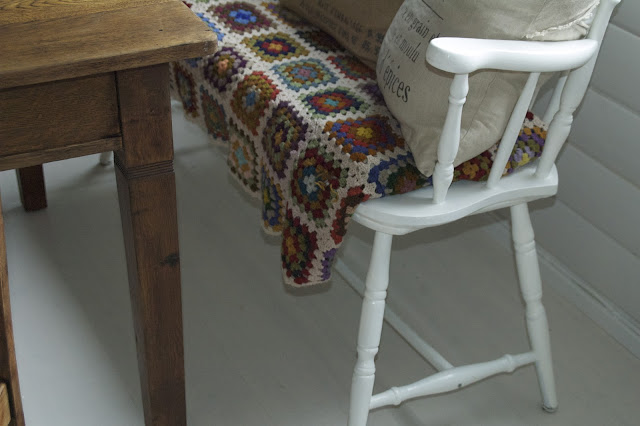 | Kos ! Rutelappe teppet som mormor heklet i sin tid , fikk komme på benken. |